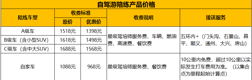 *2-自驾游陪练可以携带亲朋,增加人员成人120元/人,儿童(1.2m以下)60元/人。